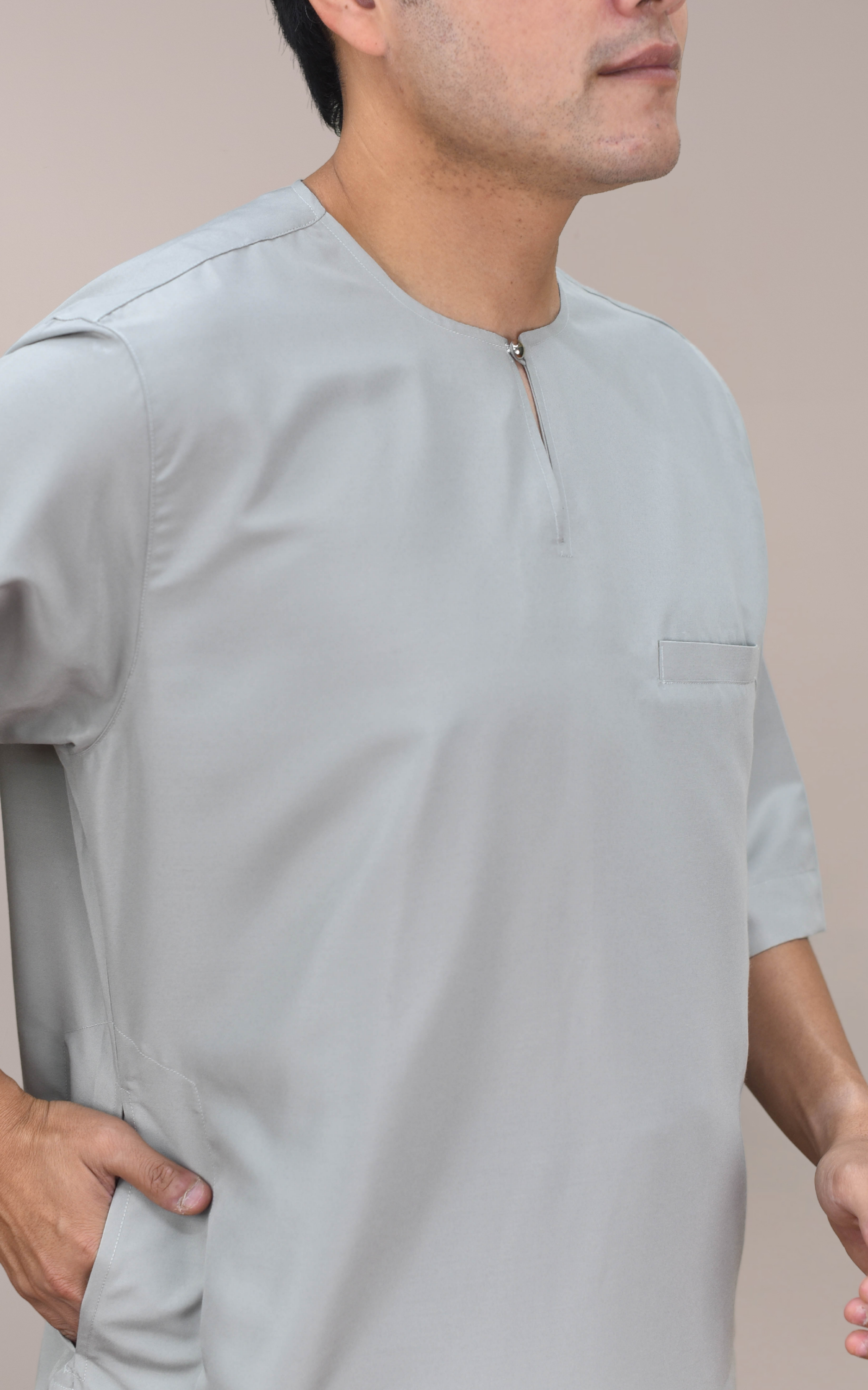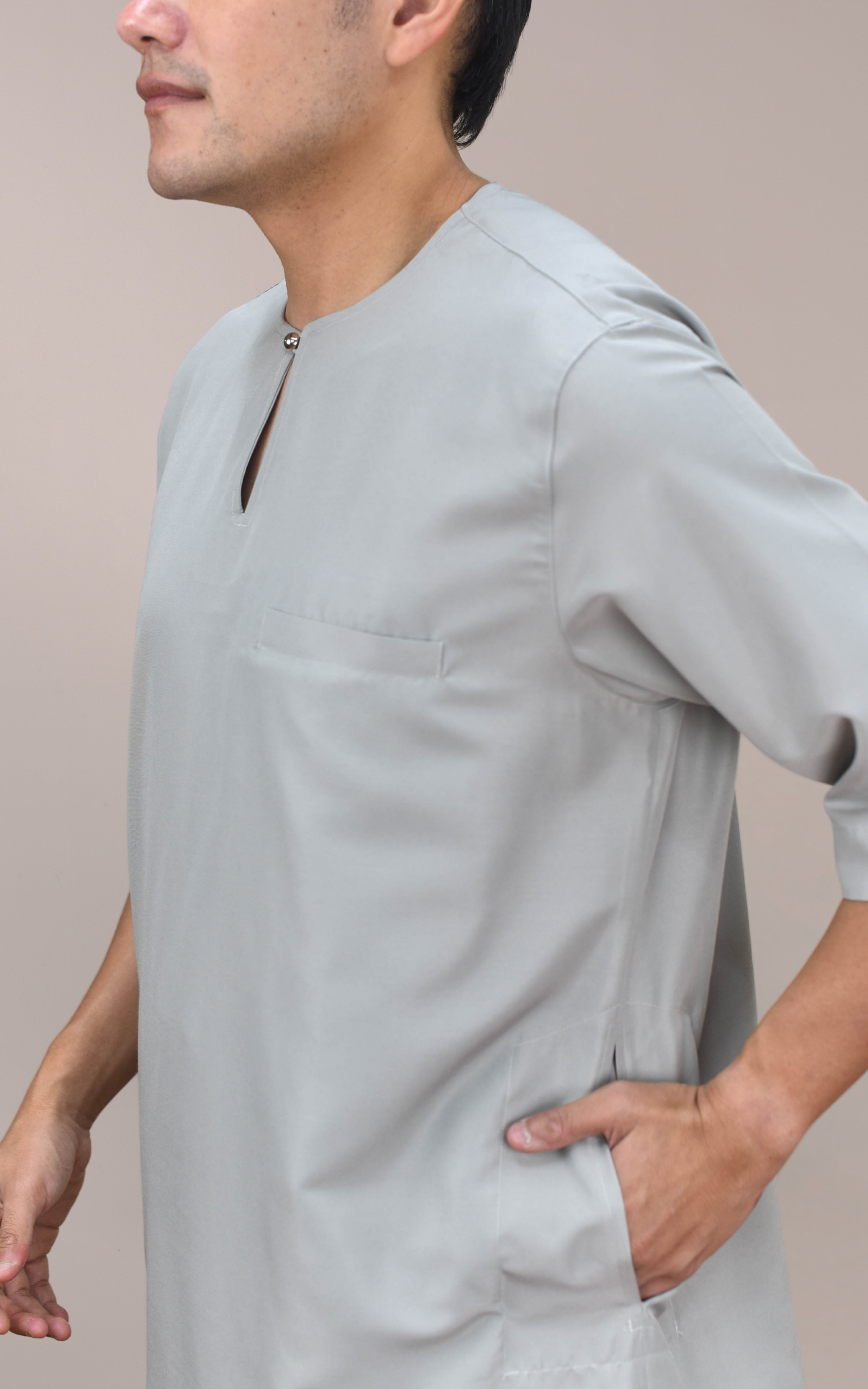 Dilengkapi potongan lengan tiga suku yang memudahkan pergerakan, terutama ketika mengambil wuduk, serta leher teluk belanga yang memberikan gaya klasik maskulin yang sopan. Potongan longgar mesra ibadah memudahkan pergerakan ketika solat, tawaf dan saie di Tanah Suci sambil mengekalkan aurat dengan baik.