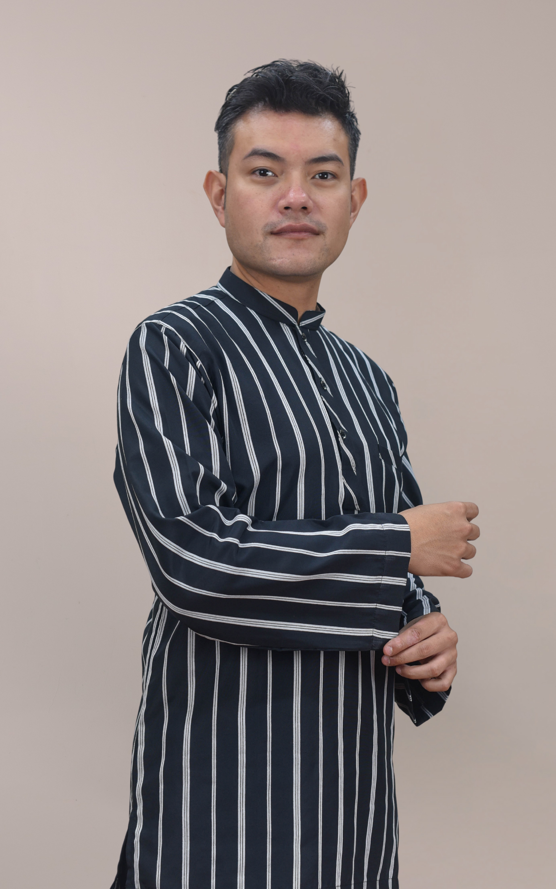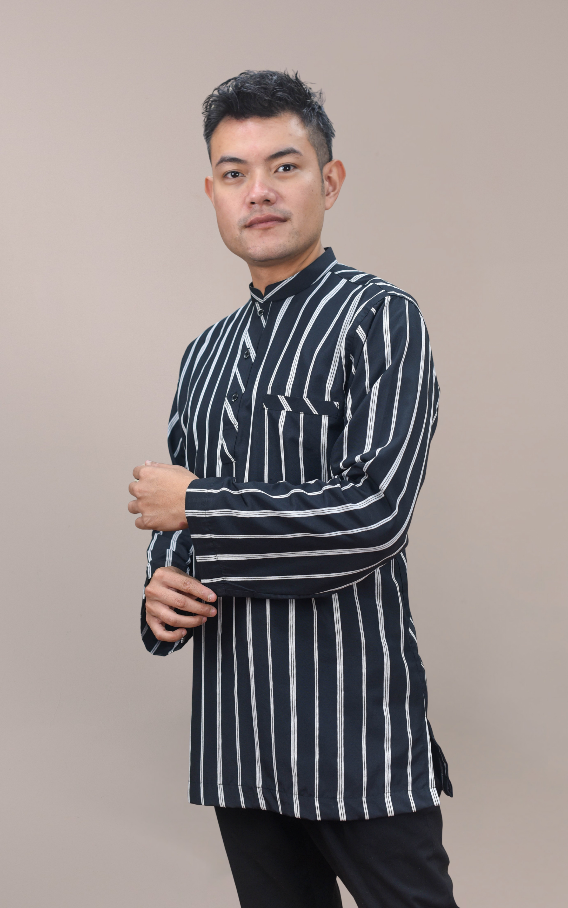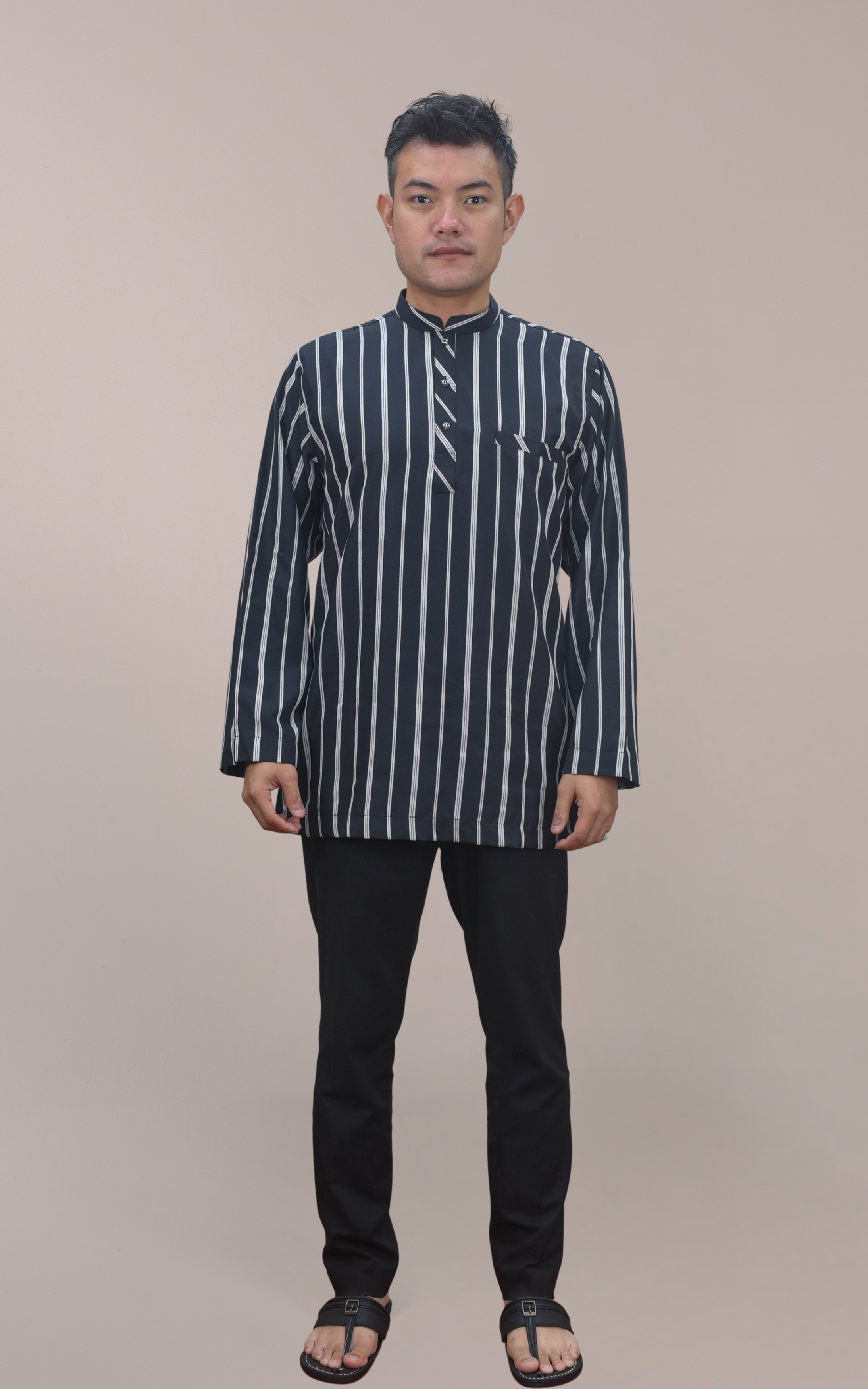 Dilengkapi dengan rekaan cekak musang moden serta corak stripe benang timbul, kurta ini tampil dengan gaya klasik kontemporari yang elegan. Potongan longgar mesra ibadah memberikan ruang pergerakan yang selesa terutamanya ketika solat, tawaf dan saie di Tanah Suci.